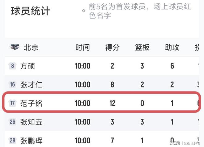 值得一提的是,本场比赛,作为北京队顶薪的范子铭,出场3分多钟,没有投篮,数据为0分1板0助1失误,场上正负值-5。在这场焦点大战中,范子铭第二节替补登场,打了几十秒就因出现失误,被主帅许利民换下场,直到末节垃圾时间,才又登场……