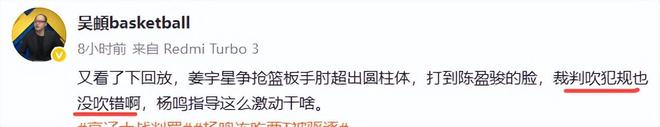可以说,昨晚杨鸣是无理取闹,舆论几乎一边倒地批评杨鸣。媒体人吴頔表示,吹姜宇星犯规没有错,他原话是:又看了下回放,姜宇星争抢篮板手肘超出圆柱体,打到陈盈骏的脸,裁判吹犯规也没吹错啊,杨鸣指导这么激动干啥。
