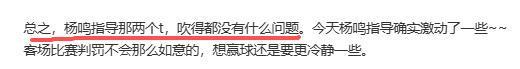 别跑刚背猪也说:杨鸣指导那两个t,吹得都没有什么问题,今天杨鸣指导确实激动了一些。付政浩也痛批杨鸣,他表示“杨鸣在场边都非常投入,不断地激励球员以及向裁判施压,看得出来他心气很高。”付政浩指出,杨鸣上一场比赛也是对裁判不满,并喊话裁判(原声被传出来)。